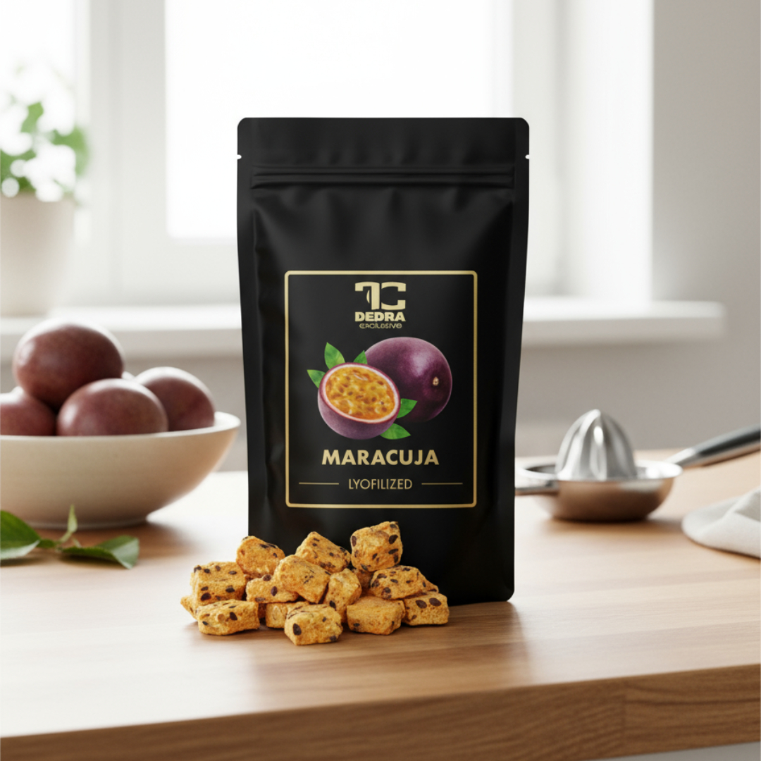 Marakuja liofilizowana to esencja tropików, zamknięta w chrupiącej, intensywnie aromatycznej kostce. To Twoja chwila egzotycznej ucieczki od codzienności – smak, który natychmiast przenosi myślami na rajską plażę. Dzięki zaawansowanej technologii liofilizacji, czyli suszenia mrozem, udało nam się uchwycić ten złożony, słodko-kwaśny bukiet smaków, zachowując przy tym 100% wartości odżywczych świeżego owocu.